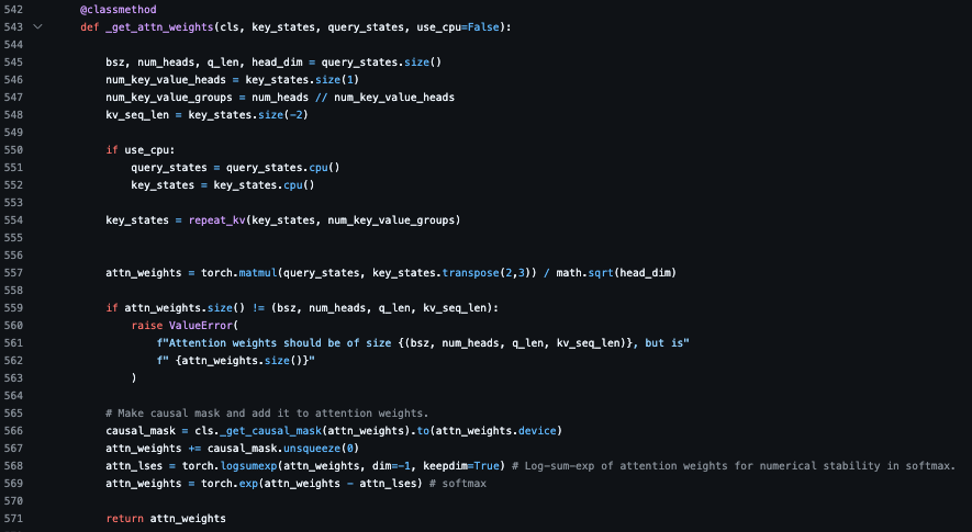 _get_attn_weights를 통해 query_states와 key_states 간의 내적을 이용한 어텐션 가중치 (attn_weights) 행렬을 리턴함을 확인할 수 있습니다.