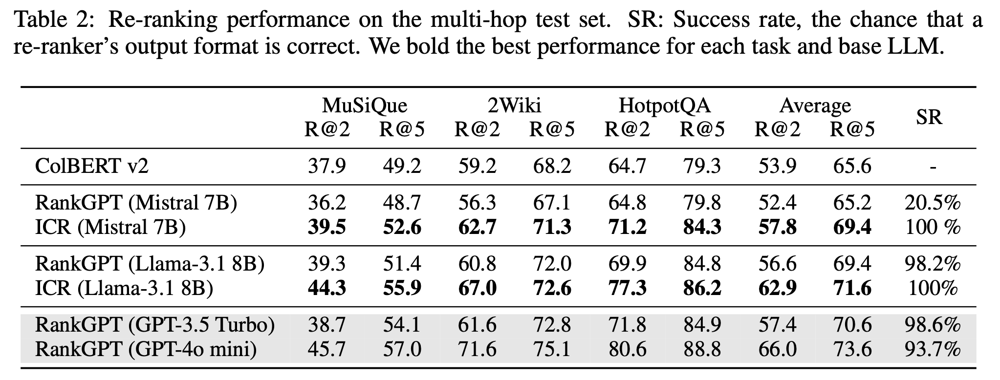 3개의 벤치마크 데이터에 대하여, ColBERT v2로부터의 retrieval 결과들을 re-ranking 진행했을 때 RankGPT와 ICR 모두 대체적으로 향상된 점수를 얻었습니다. Single-Hop과 비슷하게, ICR이 RankGPT보다 모든 항목에서 더 높은 점수를 받았다는 점이 인상적입니다.