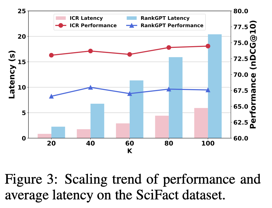 그래프에서 볼 수 있듯이, ICR이 RankGPT보다 최소 2배 이상 빠른 Latency를 보입니다. 그러면서도 RankGPT는 K=40 이상부터는 성능이 향상되지 않는 반면, ICR은 꾸준히 향상되고 있음을 보여줍니다.