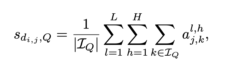 공식에서 사용하는 I_q는 쿼리 Q에 대한 토큰 인덱스 집합을 뜻합니다. 공식을 다시 보면, 모든 층, 모든 어텐션 헤드에서 쿼리 Q에 대해 i번째 document와의 어텐션 가중치 합이라는 것이라 이해할 수 있습니다. (저는 이해하는데 1시간이나 걸렸네요;;)