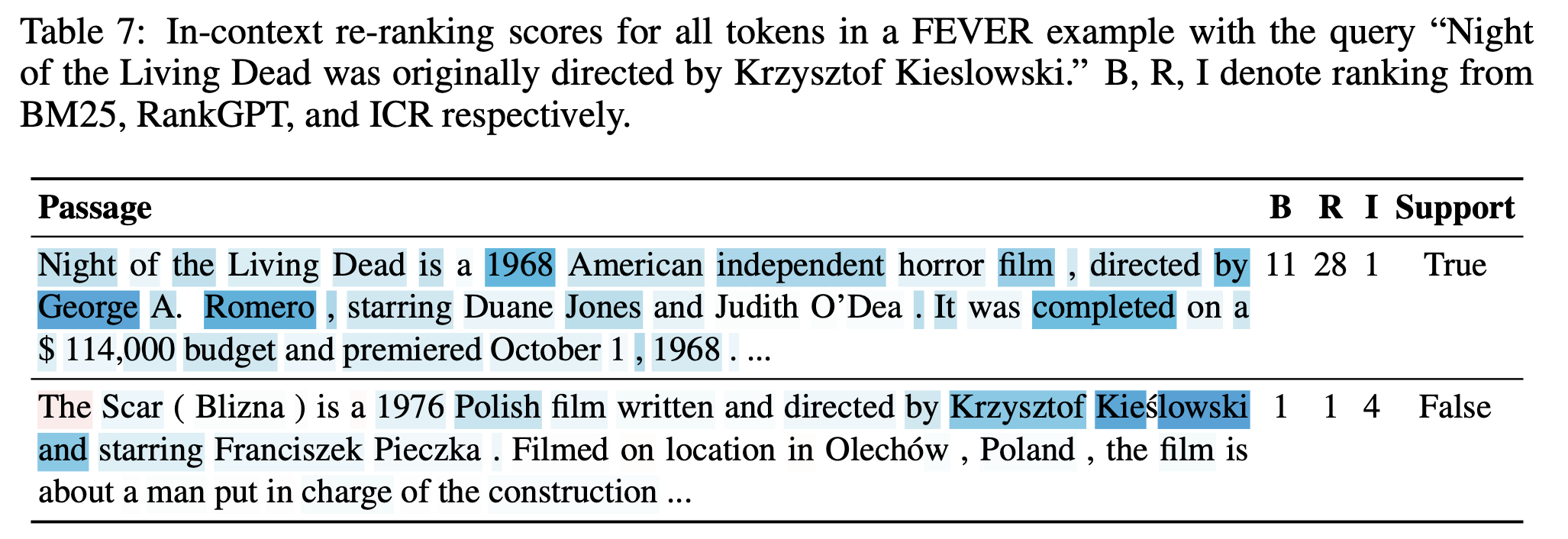 예시를 보면, 특정 영화의 감독이 Krzysztof Kieslowski라는 쿼리에 대해, 모순되는 정보를 지닌 첫 번째 패시지에 BM25, RankGPT는 각각 11위, 28위를 부여했으나, ICR은 모순된 패시지임을 파악하고 1위를 부여했음을 보여줍니다. 실제로 패시지에서는 해당 영화의 감독이 다른 사람임을 나타내고 있죠.