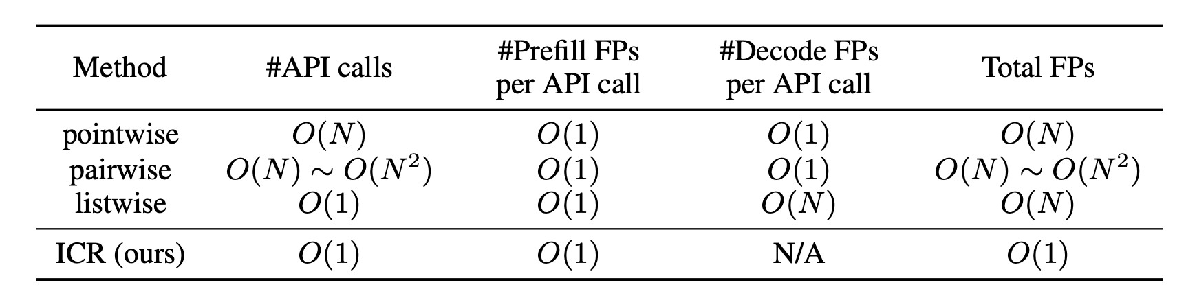 기존 방식과 비교했을 때, ICR은 N개의 document를 re-ranking할 때 오직 2개의 forward pass만 필요하기 때문에,