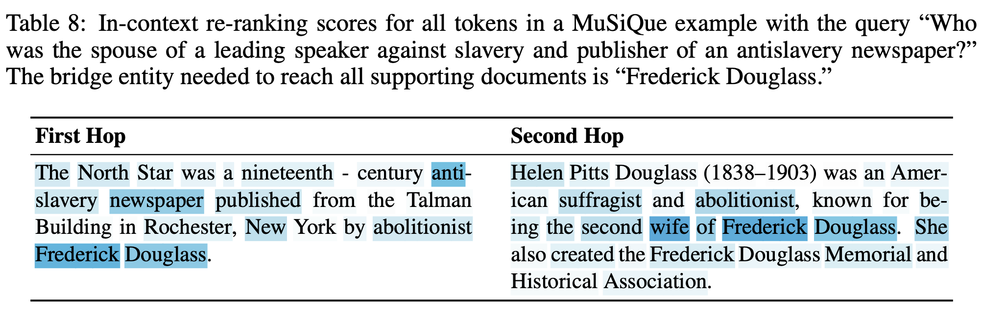 토큰 단위의 분석을 통해, 연구진들은 ICR이 특히 정보 통합 과정에 가장 중요한 bridge entity 토큰에 높은 랭킹을 부여한다는 것을 발견했습니다. 예시에서도 볼 수 있듯, First Hop과 Second Hop을 통합할 때 bridge 역할을 하는 Frederick Douglass 엔티티 토큰에 강하게 점수를 부여하고 있음을 볼 수 있죠.