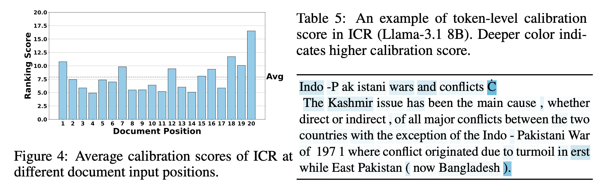 평가에 사용된 20개의 Document에 대한 calibration ranking score를 확인해보니, 좌측 그래프처럼 초반부나 후반부에 입력된 document들의 점수가 평균으로부터 멀리 있음을 알 수 있습니다. 이를 통해 lost-in-the-middle 이슈와 같은 position bias가 기존 LLM에서 나타나고 있음을 유추할 수 있습니다.