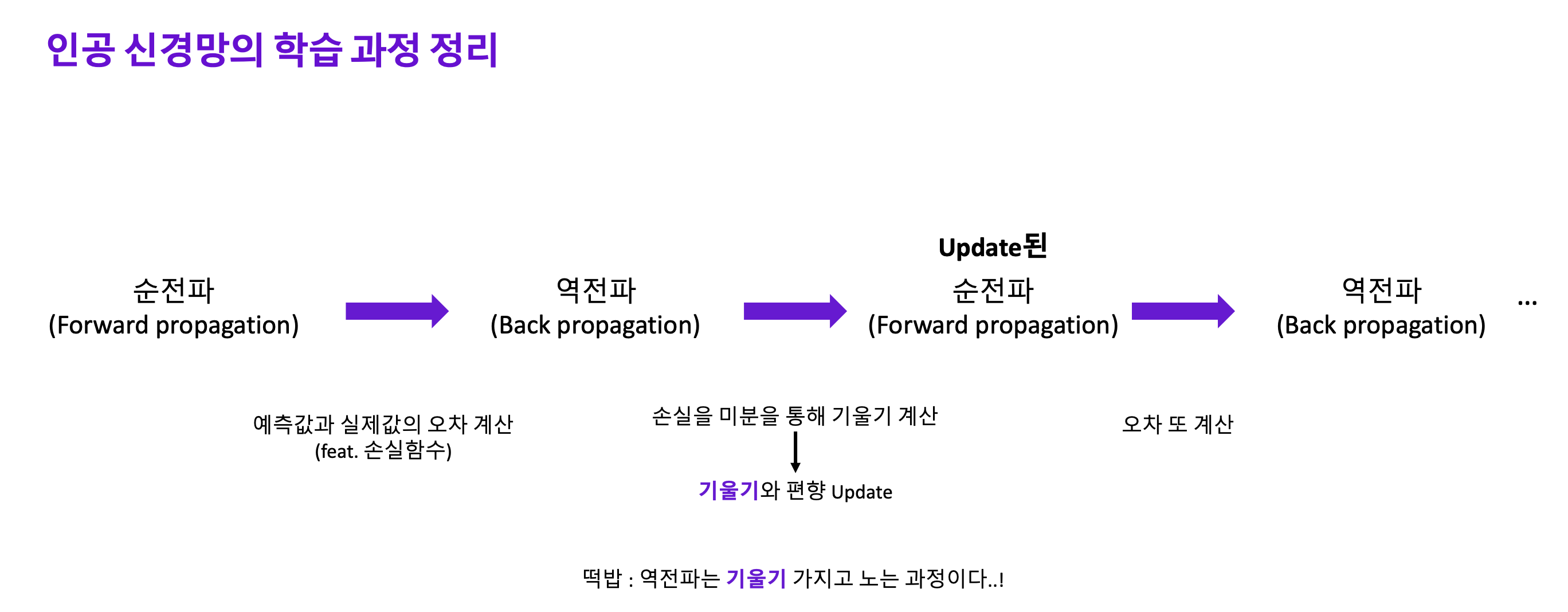 순전파와 역전파의 반복을 통해 모델이 학습되는 과정은 아래와 같습니다.