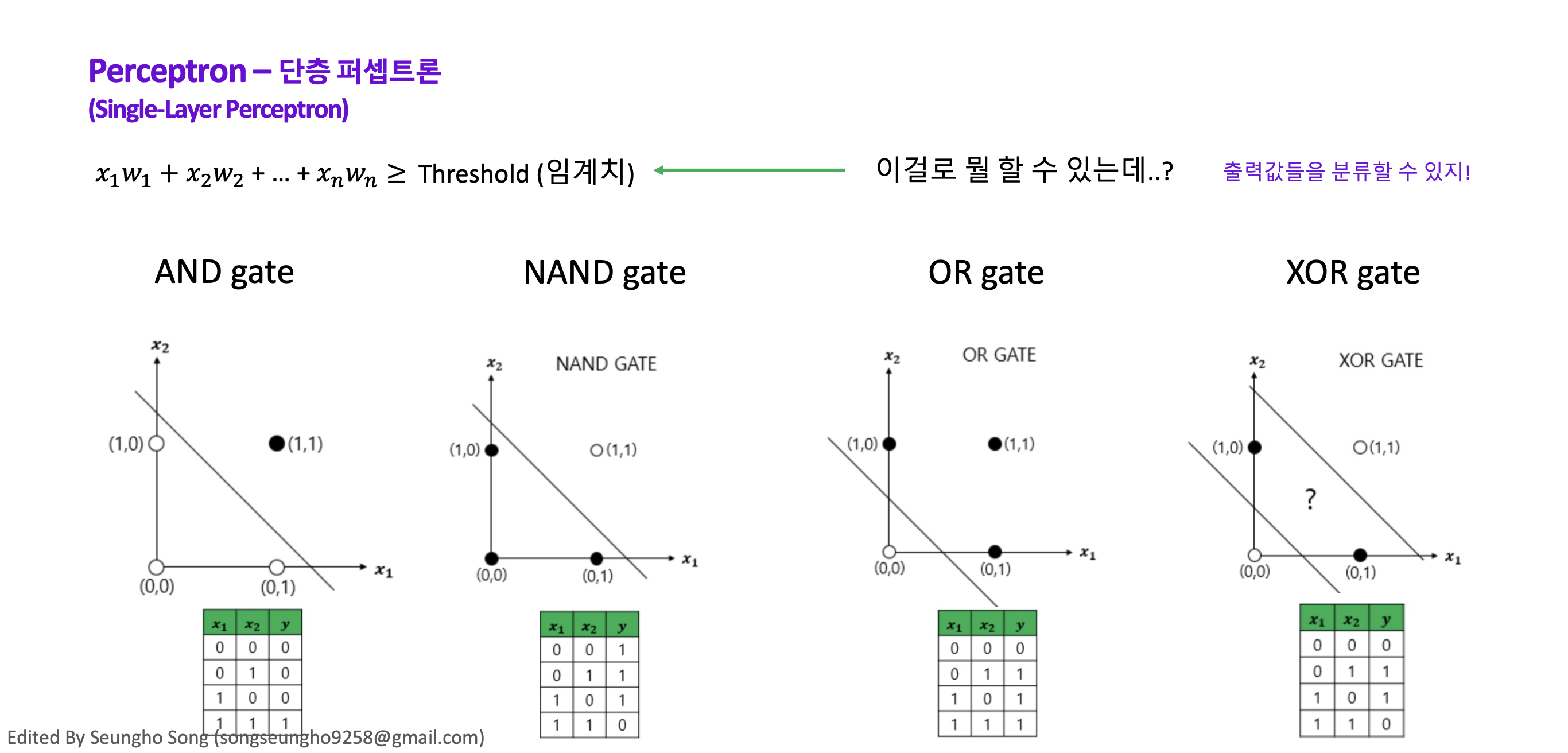 AND, NAND, OR gate는 줄 하나로 하얀색과 검은색을 구분할 수 있지만…XOR는 두 개가 필요하다는 점입니다.